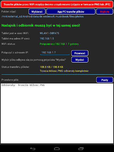 The songs to be displayed can also be images in PNG or JPG format. If the images reside on a PC, you can transfer them with a special file transfer program. In MusicBook a file transfer module is integrated. For the PC (Windows, Linux or Mac OS) is a FREE file transfer program available for download from: