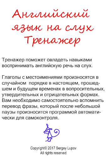 Глаголы в сочетании с субъектными местоимениями произносятся в случайном порядке в настоящем, прошедшем и будущем временах в вопросительных, утвердительных и отрицательных формах. Необходимо самостоятельно вспомнить перевод фразы, который после небольшой паузы произносится программой автоматически для самоконтроля.