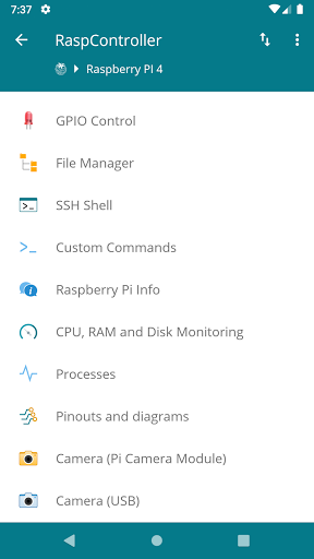 The RaspController application allows you to easily manage your Raspberry Pi remotely. Now it is possible manage files, to control the GPIO ports, send commands directly through the terminal, view images from a connected camera and obtain data from different sensors. Finally, wiring diagrams, pins and various information are available for the correct use of the Raspberry Pi.