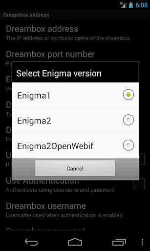 The first time this app is used it will attempt to automatically detect the address of the dreambox. If the autodetection fails the dreambox address has to be configured manually. To configure the dreambox address select Settings from the options menu (see screenshots above).