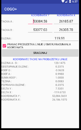 Ukoliko pak izaberete racunanje koordinata na produzetku linije morate uneti koordinate krajnjih tacaka linije kao i duzinu na produzetku linije. Ovde imate mogucnost dobijanja koordinate linijske tacke u pravcu linije ili u obrnutom pravcu.
