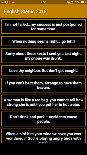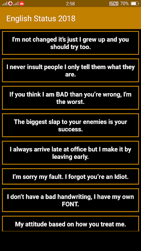 This app brings you the best status collection of 2018 in English . Show your attitude & personality with these attitude status in