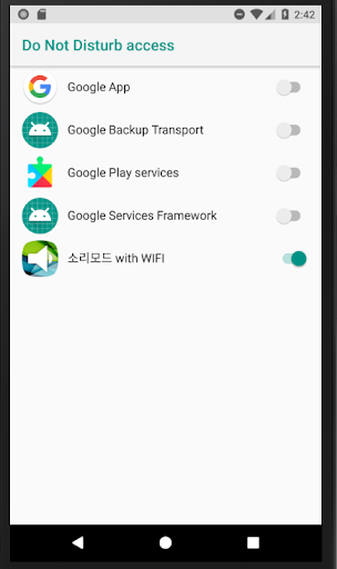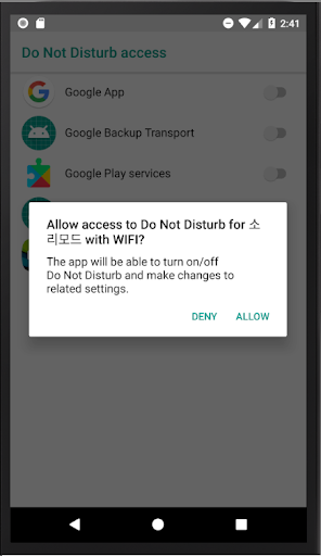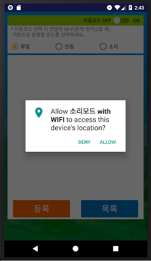 - 해당 응용프로그램이 와이파이존에서 자동으로 소리모드 전환을 실행하려면 반드시 위치 사용 권한이 필요합니다.
