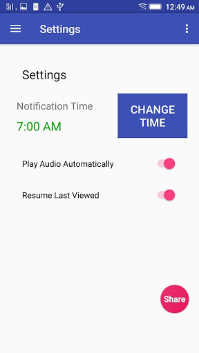 You can set everyday reminder to teach your children. You will get notification when every day, at desired time set by you in the settings page. You can also set some image as your wallpaper, if you like the image. You can control the audio playing automatically or you want to play only when you are taping the speaker icon. Also you can control whether to save the last viewed item, so that you can continue learning tomorrow, from where you left.