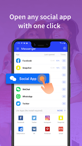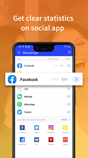 With the Messenger, you can open any chat with one click whenever you want to have a messenger with your friends and families, it will show times you opened each messenger app and the most used messenger app.