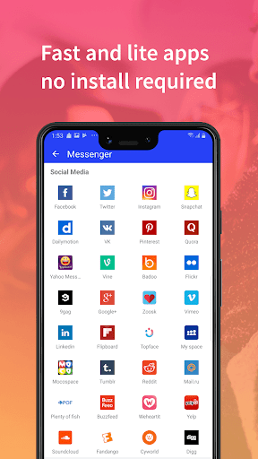 ♦ Quick visit Lite App: Access to the more popular social app in website with free non-installation required, with no mobile network traffic consumption.