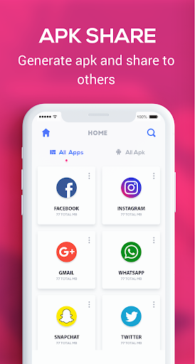 Apk share is a free app for android to create apps apk and can share them via Bluetooth, WhatsApp and any other social media. Apk Share show your installed apps in a list and you can generate apk files on just 1 click.