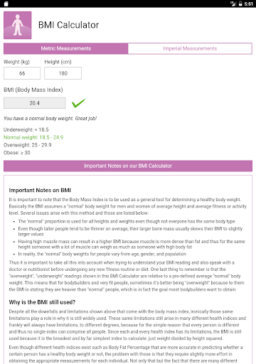 BMI Calculator is the Android version of the very popular web application https://bmicalculator.mes.fm (formerly bmicalculator.cc) made by Math Easy Solutions.