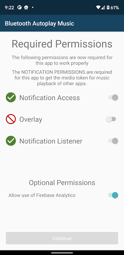 Great app it works. Even better than some similar paid apps. One little improvement is to play music asap instead of delay for 30 sec upon connection.