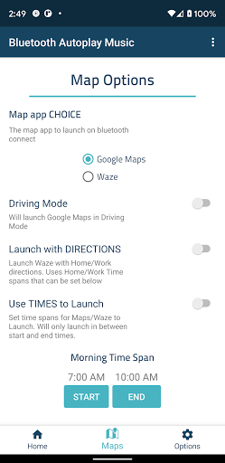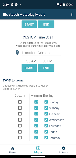 - Use times to launch to launch Maps/Waze - Will only launch Maps/Waze in between start and end times.