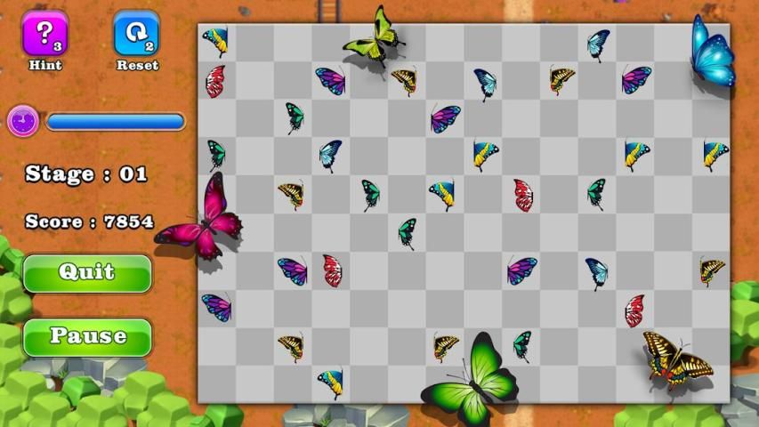 Match two identical Butterfly pictures and empty the whole field so the gamer must make the pairs of identical and adjacent butterflies to make them disappear. The process should be continued until the entire board is cleared in the limited time.