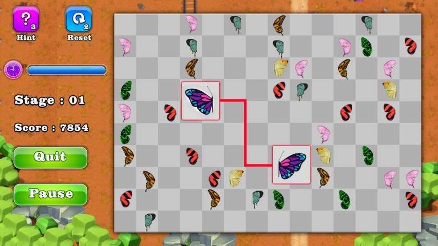 Try to find two matching tiles of butterflies and connect them with a line with no more then three angles. You must create a path between the two matching tiles, but make sure that the path is not blocked by any other tiles. If you run out of moves, the game is over. You must clear all the blocks within the designated time frame to proceed.