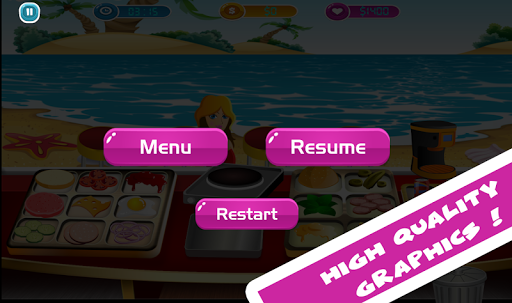"Beach Restaurant 2 " is for everybody: Children, Young men and Young ladies who love to demonstrate their inventiveness and abilities as a gourmet expert. Beach Restaurant cooking games is exceptionally testing game since you need to finish errands with in constrained time. In Beach Restaurant cooking games you need to finish client's request and serve him/her with in the given time point of confinement to fulfill him/her. On the off chance that you neglected to serve your client in the given time he/she will turn down and take off.