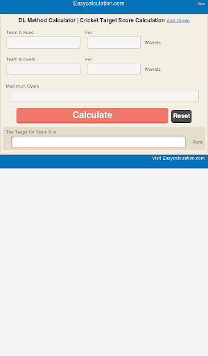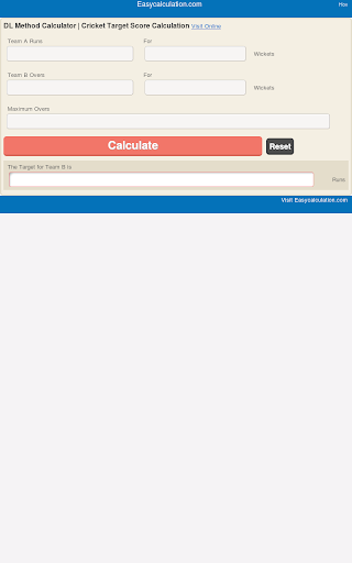DL Method Calculator calculates target scores for rain interrupted limited overs cricket matches.