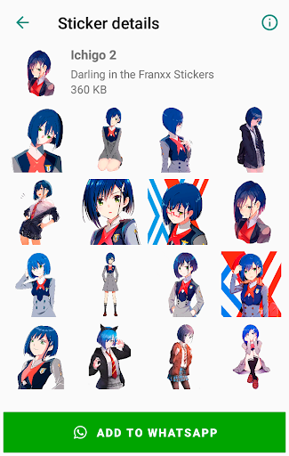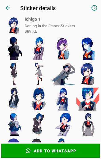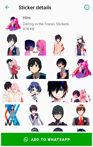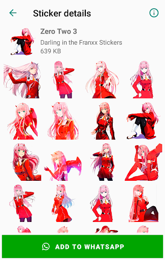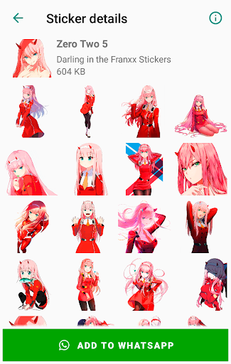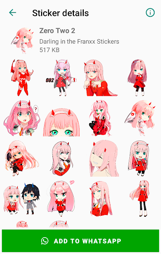 This app contains a large collection of packs of Darling in the Franxx Stickers for WhatsApp. Zero Two Darling in the Franxx for WhatsApp stickers collection, with many different stickers set. Now express yourself using awesome Darling in the Franxx Stickers with WAStickerApps.