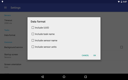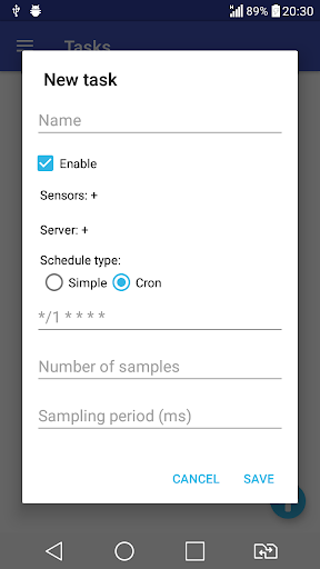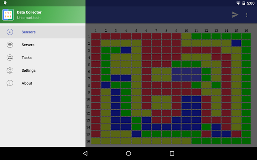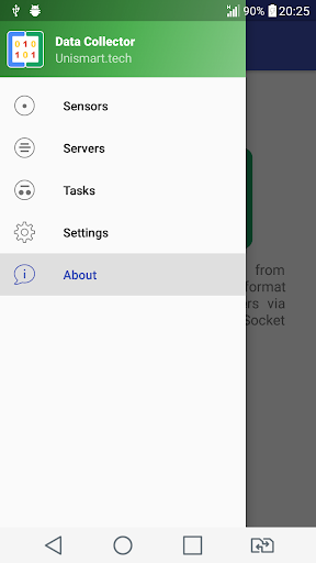The entity of Data Collector operation is execution of tasks, that run at assigned time periods. All tasks can operate in the background, when you don't use user's interface of the app. Required sensors and server, where data from sensors is supposed to be sent in JSON format,