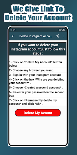 Now you can delete your Instagram account or facebook or tiktok or more websites and apps by following the steps on our app Delete My Account.