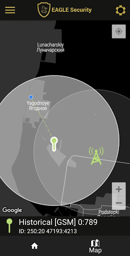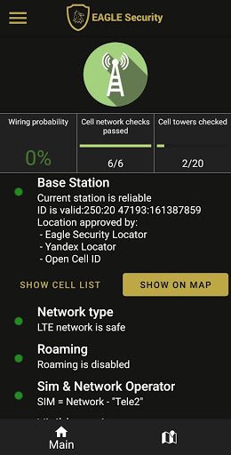 Protection: tracking all the stations your cell phone connects to. Eagle Security checks the signature of a station, mostly tapping complexes have substandard signatures. And it also tracks positions of stations. If a station appears in different places or appears in a new place near to a station placed in the same place before it’d be marked as a suspicious and all the other users will be informed if they connect this station.