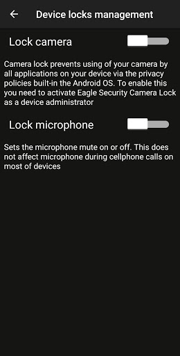 Eagle Security also provides functionality to disable camera and/or microphone on your phone to make it impossible for any spyware to use them when you want to be sure that your phone is not listening or watching you.