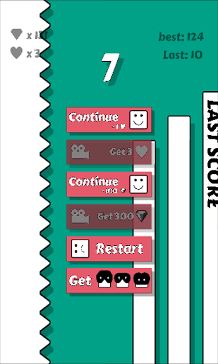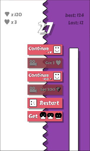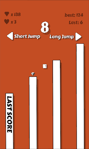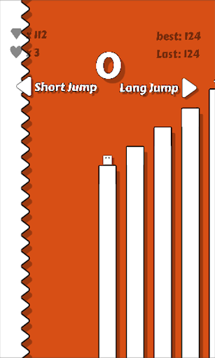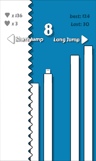Geometry Jump Free is a very addictive game, "easy to play, hard to master" style. How to play? Just tap at any screen position to move the player. With a short jump you earn one point. With a long jump you earn two points. If you jump and miss a white tile platform, and you don't have any white tile platforms below : you lose! Try to do as many jumps as you can, don't be touched by the big boss wall with spikes coming from the left, continuously, and don't fall by missing tiles. Install Geometry Jump Free now!