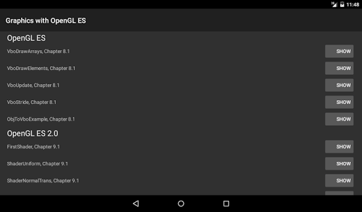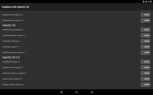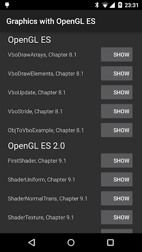 The lecture "Graphics Programming I" at Philipps-Universität Marburg, Germany, teaches how to create interactive computer graphics applications. This app demonstrates the Android GUI and OpenGL ES examples from the lecture. Detailed explanations and source code for all examples are available on the accompanying website: http://www.uni-marburg.de/fb12/grafikmultimedia-en/lectures/graphics1