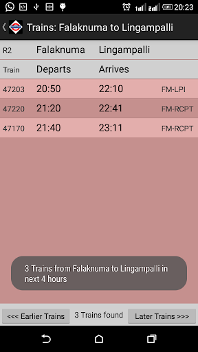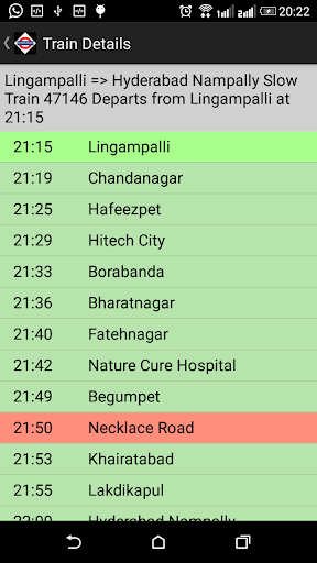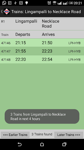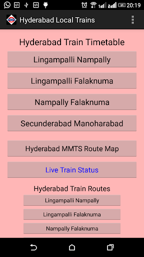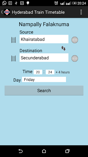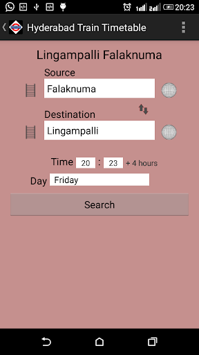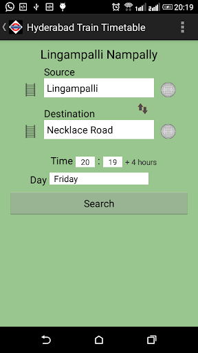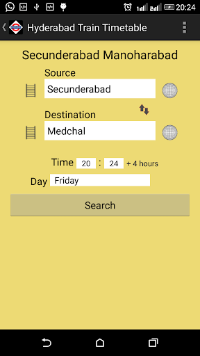 This app provides information about Hyderabad & Secunderabad MMTS / suburban / local train services running between two train stations at or after a given time of day.