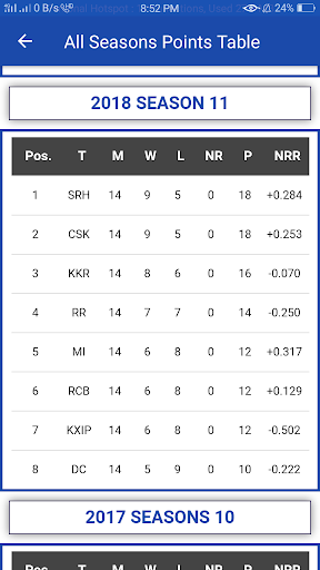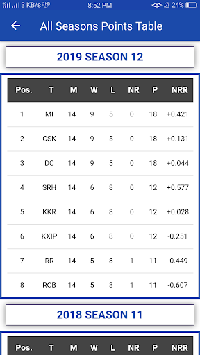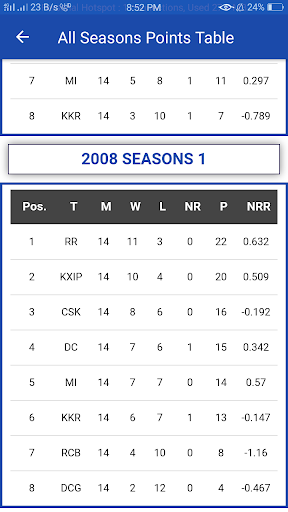 You can also check IPL all seasons points tables history in the app, this app provides Indian Premier League all seasons points tables history and data. You can check in which IPL season which team was on the top of the points table and also which were the top 4 teams in all IPL T20 league seasons.