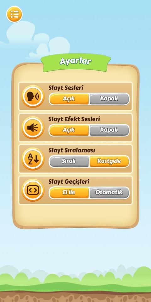 In the SETTINGS section, you can turn the slide effect sound of the game on or off. You can set the slide order to sequential or mixed. You can set slide transitions to automatic or manual transitions. The duration of auto-pass slides is 5 seconds. You can also toggle automatic transitions with the stopwatch icon at the top right of the slide screen.