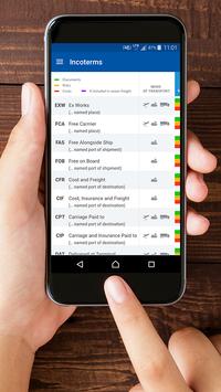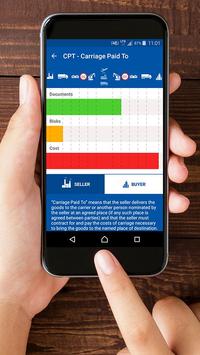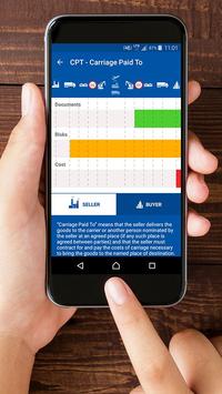 Interesting presentation of all incoterms, from EXW, FCA, FAS ... to DAP, DDP. You can scroll, minimize, fade in/fade out, overlay table view. For each rule we have prepared an individual presentation on a dedicated screen, in the context of the Seller and Buyer, which can be switched between them.