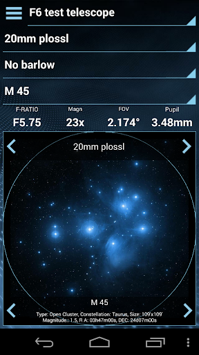 • Shows you your field of view as a circle drawn on high-res (up to 2000x2000px) full color photos of celestial objects. All objects of the Messier and NGC catalogue are available.