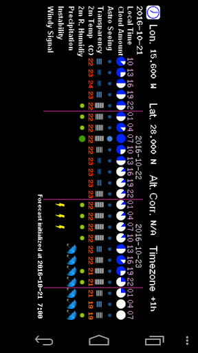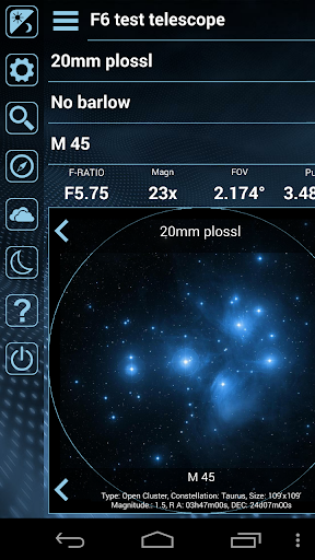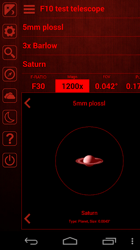 Apart from the magnification, the field of view and the F ratio of your telescope, FOViewer NG will show you the local time, your GPS coordinates, the current moonphase, a clear sky clock for your location, a bubble level and a compass to help you get that GOTO telescope properly aligned!