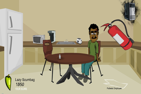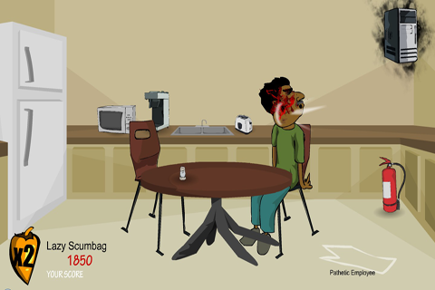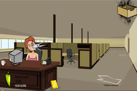 WARNING: YOU MUST BE 18+ TO PLAY THIS game VIOLENT SCENE INCLUDED.Furious at your workmates?Ever thought about killing office jerk and quit the job? Well,maybe you want to but you cannot. This game,however, realize your dream in someway without harming a soul. Good luck and take some anger out on that stupid boss of yours!TAP on objects in the office to use the item as weapon and to make some crazy things with it. This is a virtual place to whack your boss and office jerks. Have fun with this cool game!SCORE BOARD SUPPORTED! SUBMIT YOUR SCORE TO compete WITH OTHER USERS AROUND THE WORLD!HOW TO PLAY:1. PICK OBJECTS BY TAPPING THEM2. THROW OBJECTS PICKED TOWARDS EMPLOYEES BY TAPPING THEIR HEAD3. ARROWS ON THE GROUND AND DOORS NAVIGATE YOUTO DIFFERENT SITE