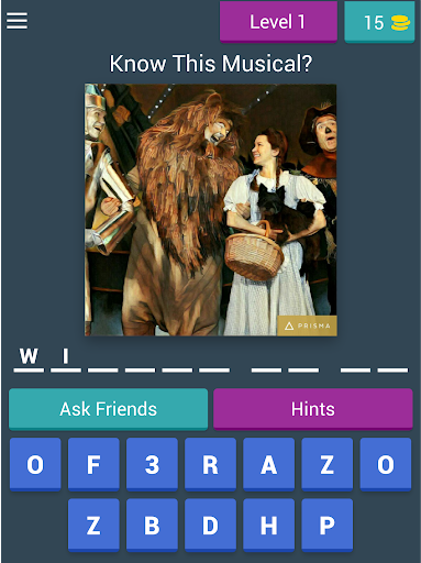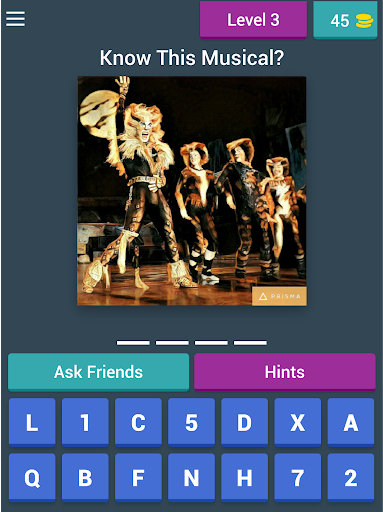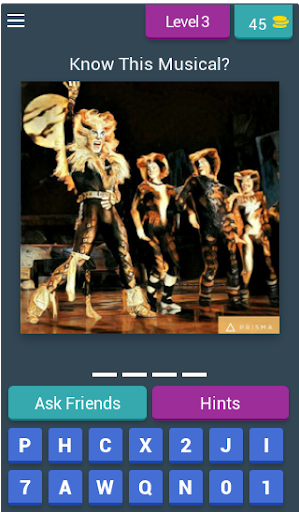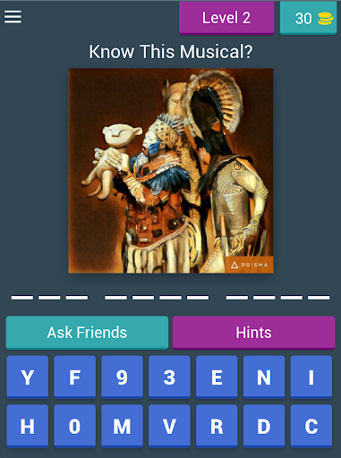 Each "guess the picture" level will show a different unique image art from musicals on Broadway, past or present, as the levels get higher the musicals get more difficult - level up,