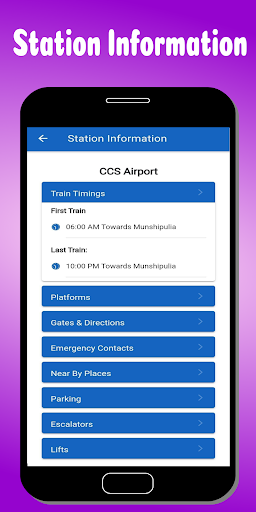 4. Station Information :- Lucknow Metro App gives you detailed information about a particular station including Train timings, Platforms, Gates and Directions, Nearby Places, Emergency Contacts, Parking, Escalators, Lifts.