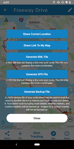 Using the export options, you can export your route to a KML, GPX, or backup file which can then be shared through any supported installed app. In addition, you can also share a link to your route. Every time you share a link to your map, your route is exported to the cloud and made available for public viewing to anyone with a link. A special link is then generated which will display your route in any web browser making it a perfect way to share your route with your friends and family.