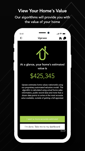 Upraze's estimated market value is computed using a proprietary formula developed by top Real Estate Agents, Appraisers and Investors from around the U.S. and is not an actual appraisal completed by a state licensed appraiser. Some screens simulated; sequences shortened. Google and the Google logo are trademarks of Google, Inc., registered in the US and other countries. Android is a trademark of Google, Inc.