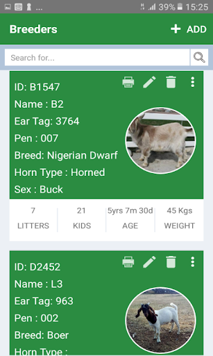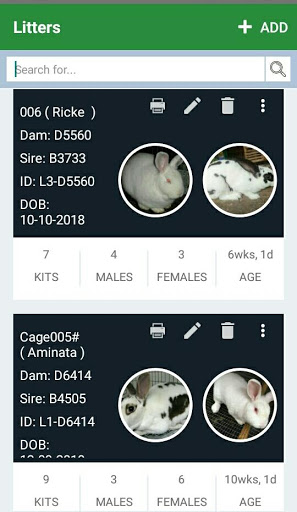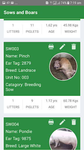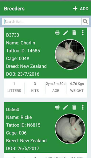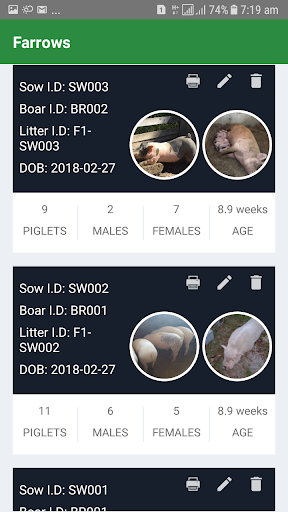 The farmer can print out farm records, like breeding, serving/mating, farrow/litter records, and can also print out Doe/Sow, Buck/Boar, medical and litter cards to track the records of each individual animal