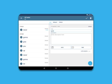 Allows you create сonvenient and informative notes, notifications, tasks and lists. Create topics for tasks. Organize and sort.