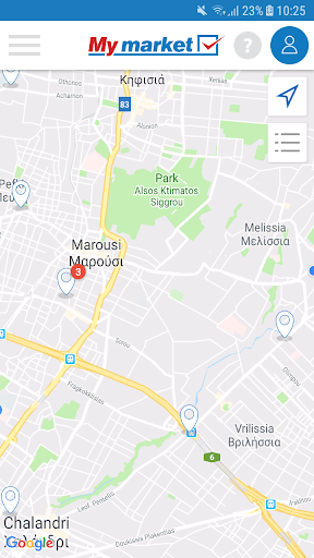 - Εύρεση πλησιέστερου καταστήματος My market και εμφάνιση καταστημάτων σε λίστα με δυνατότητα αναζήτησης.