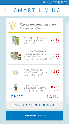 - Smart Living: Έτοιμες λίστες με προτάσεις προϊόντων από τις τρέχουσες προσφορές για διάφορες περιστάσεις.