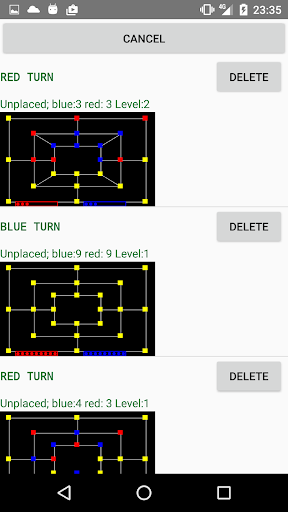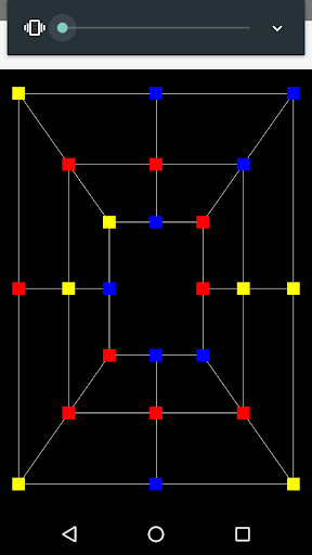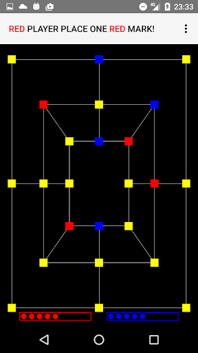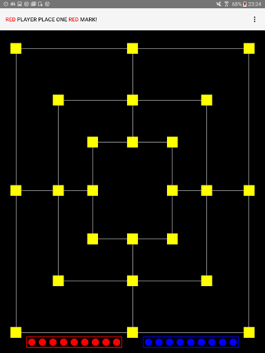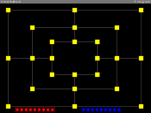 The classical boardgame Nine Men's Morris, also known as Cowboy checkers. The game is for 2 human players who are playing face-to-face.