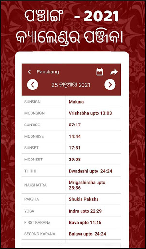 Odia Panjika 2021: App gives all important panchang details like Lunar Month, First Karana, Second Karana, Sunsign, Moon Sign, Abhijit Kala, Our Muhurtam, Amrita Kalam, Rahu Kalam, Gulika Kalam, Yamaganada kala and Varjyam