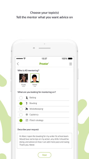 Using the Proatar app, the passionate amateur records a video of themselves playing the game. They choose a mentor from the Proatar Consultants Directory, a carefully curated, elite list of professionals who are (or were) involved with the game at the highest level. A consultation request is sent to the chosen elite with the video, all through the secure Proatar platform.