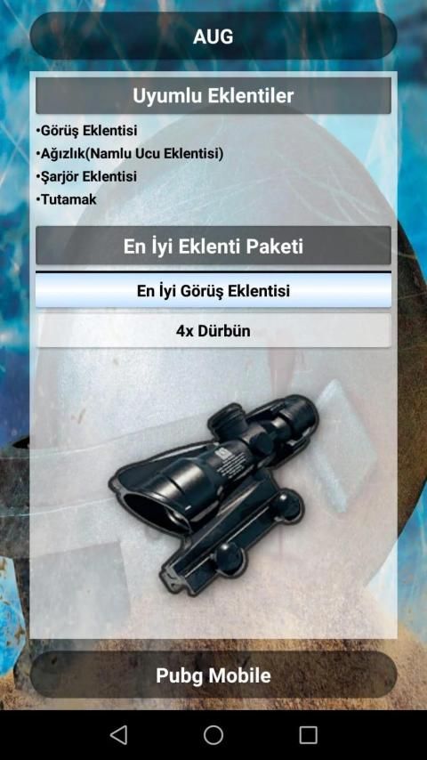 Pubg Mobile için challenge üretici ve rehber uygulaması. Pubg Mobile içindeki silahların hangi tipte mermi kullandıklarını, mermi başına verdikleri hasarı, menzillerini, ateş frekanslarını, hangi klasmanda olduklarını merak ediyorsanız bu uygulama tam size göre. Pubg Mobile oynamaya yeni başlayan arkadaşlarınız var ise onlara tavsiye edebileceğiniz, Pubg Mobile oynamaya yeni başlayan kişi siz iseniz sizin kullanabileceğiniz Pubg Mobile Rehber Uygulaması şimdi markette. Uygulamanın yapabildikleri bunlarla sınırlı değil. Bu oyunda usta olduğunuzu düşünüyorsanız ve bir meydan okuma peşindeyseniz rastgele challenge üretici bu uygulamanın içinde. Sadece Pubg Mobile değil, Pubg ve Pubg Lite için de oldukça faydalı bir uygulama. Silah eklentileri, hangi silahların hangi eklentilerle uyumlu oldukları, silahlar için en iyi eklenti paketleri bu uygulamada. Oyun içi silah sesleri de artık sizinle. Bu uygulama çorba paranızı çıkartmanızda size yardımcı olacak. Hepinize iyi oyunlar!