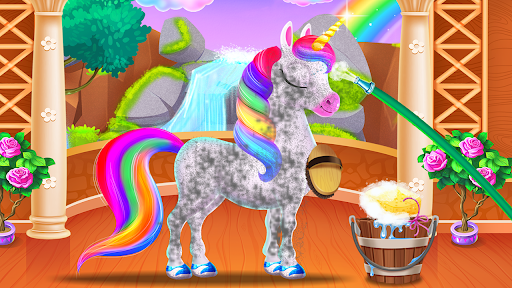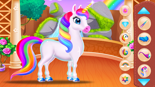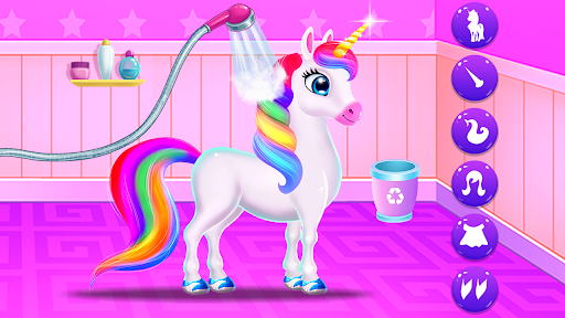 You must try our new unicorn game where you are closer to the rainbow than you ever were. Find the challenges that come within the game and complete all levels. Take good care of your lovely rainbow pet and make sure you fulfill his needs and wishes. Clean the unicorn and wash his body using the special shampoo, also you will have to handle his mane and tail. After you rub all the dirt away you will get him to see a doctor regarding his health. Do a medical check-up and find whatever is hurting him and make it stop. Use the proper treatment and get him better. Once this procedure is over you will take him to the farrier so his hooves can be changed. There are specialized tools that must be used in order to succeed. Replace the old and used hooves and help your unicorn walk again without any pain in his legs. After all this, you have to pamper your pet with a spa session. Apply facial treatments and make his skin glow. Groom him and add some cute makeup to complete his look. Now you will have to pick a proper outfit to match his face makeover. Put on pretty stickers, choose his mane color, and mix it with his corn. Use playful details to make your pet look like a rainbow unicorn. Don't forget about the feeding part where you have to play an interactive game to catch some apples so you could serve him. Get the stable ready for him by cleaning and redesigning it. Use your style to create something different, but also modern. All that left is to get into running where your animal will be able to run free in many maps and lands. Help him collect the apple points and finish the game.