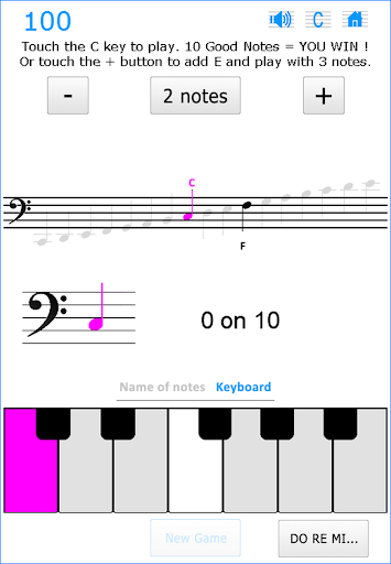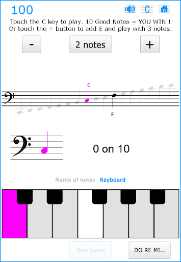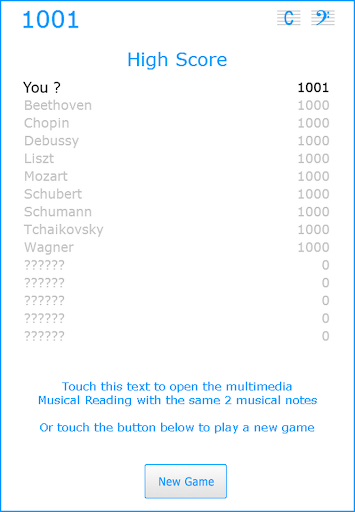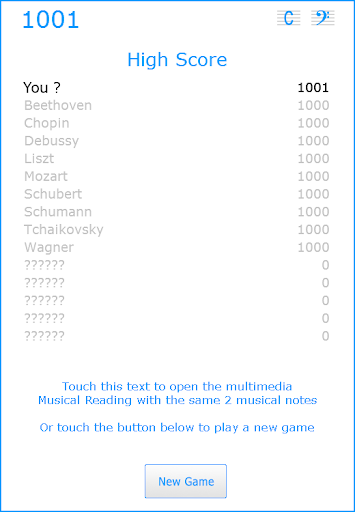 Start with just 2 musical notes and gradually add new notes to improve your High Score. The more new notes you learn and the faster you can recognize them, the more points you win !