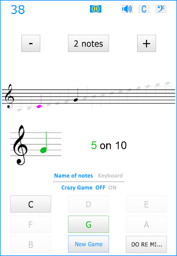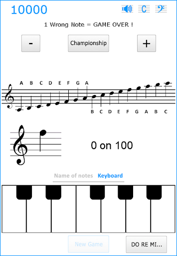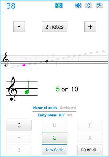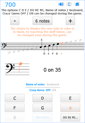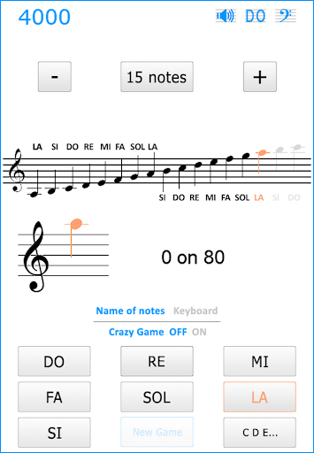 You can choose between the syllabic notation - DO RE MI FA SOL LA SI - or alphabetical - A B C D E F G - and change at any time, even in the middle of a game. In the same way, at any moment, even during a game, you can choose to replace the name notes by a keyboard keys.