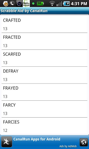 Scrabble Aid is an app that will help you become a better Scrabble player. It will check to be sure a word is in its scrabble dictionary, and it will find the anagrams for available Board and Bar letters. it sorts its results by word score and length, although it does not account for double and triple squares.This app has a very simple and intuitive interface. It even allows you to cancel its anagram search function, which can take a minute or two.Instructions:Scrabble Aid opens to the main quot;search amp; findquot; page. In the top section on the main page, tap in the edit box adjacent to the Find button. The keypad will open Hint: you can enter words and letters using Android39;s Voice Recognition interface. Enter a word and press Find. A dialog will show confirming quot;Foundquot; or quot;Not Foundquot;. Add the letters from your Bar and the playable letters from the Board into the two edit boxes in the middle section. Use the question mark, quot;?quot;, character in the bar letters to represent the wildcard gamepiece. The anagram search result will contain one of the letters from the list of Board letters. In addition, as many Bar letters as possible are used to complete the anagram. Press Search. A dialog with a progress bar and a cancel button will appear. Press the Cancel button to stop the search. When the search completes, you are taken to the Results page and shown a list of the anagrams found, with their word scores. Tap one of the words to select it, or perform a long click to open the Result Actions dialog. You will be brought back to the main page and the selected word is shown in the bottom section. Clicking Last Results will bring you back to the Results page.Visit the CanalRun Android home page at android.canalrun.com to view all of the android applications from CanalRun.Scrabble is a registered trademark owned in the United States and Canada by Hasbro, Inc., and in Great Britain and everywhere else in the world, by J.W. Spear amp; Sons PLC, a subsidiary of Mattel.