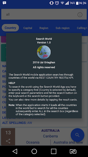 Made by Porial Enterprises Limited, the Search World App is a colorful app that searches through all the countries of the world. The search can be categorized, you can search for a Country details using the its Country name, capital, region, sub-region and calling code. To view a list of all the countries in the world input "all" in the search box regardless of the category selected.