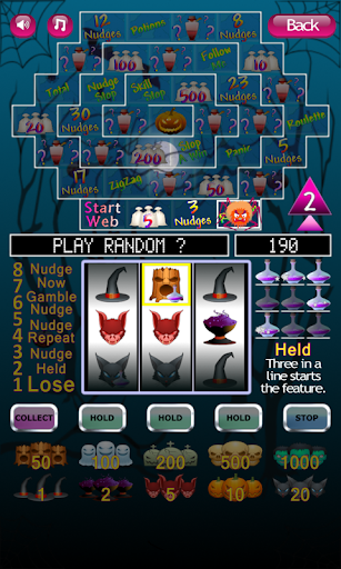 Three potions in a row in any direction starts the spooky Halloween slot machine feature.